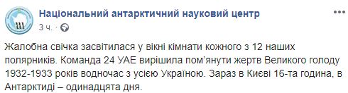 По сообщению, команда украинской антарктической экспедиции почтила память жертв голода 1932-1933 гг вместе со всей Украиной. Полярники зажгли свечи в 16:00 по киевскому времени в знак памяти о погибших.