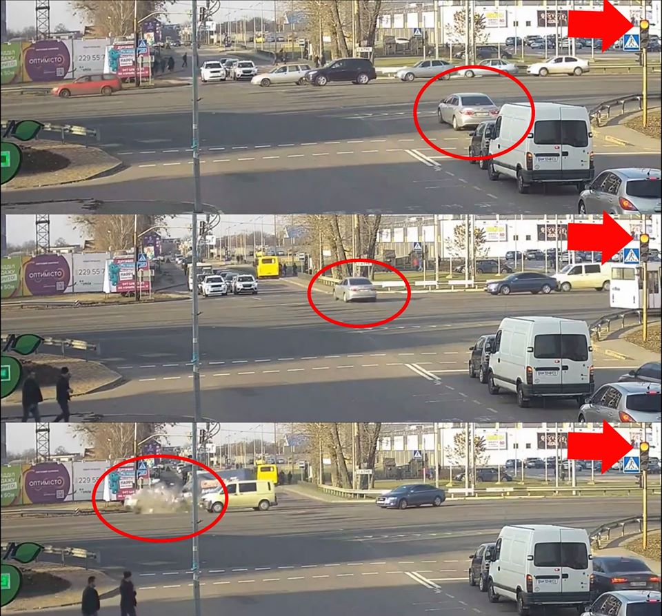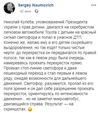 "До перекрестка он (Кулеба - Ред.) передвигался по правой полосе, так как в левом ряду была очередь, намереваясь проехать перекресток прямо. Проехал стоп-линию светофора и стал первым в левом ряду, ожидая возможности для дальнейшего движения. Светофор, разумеется, пропал из его поля зрения и он дал себе разрешение проехать перекресток, ориентируясь по интенсивности движения... но не заметил микроавтобус, двигающийся справа. Результат — на скриншотах", - пишет Наумович.