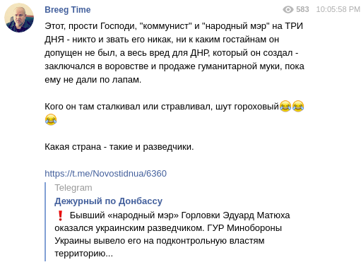 "Этот, прости Господи, "коммунист" и "народный мэр" на ТРИ ДНЯ - никто и звать его никак, ни к каким гостайнам он допущен не был, а весь вред для ДНР, который он создал - заключался в воровстве и продаже гуманитарной муки, пока ему не дали по лапам. Кого он там сталкивал или стравливал, шут гороховый.  Какая страна - такие и разведчики" - написал так Бердичевский у себя в телеграм-канале Breeg Time.