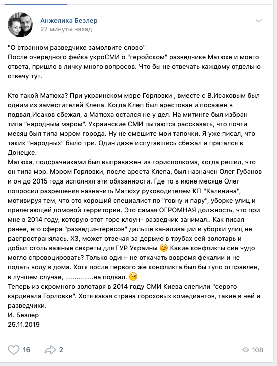 При этом в его заявлениях использовались и реальные факты (например - общеизвестный конфликт Безлера и Стрелкова), к которым Матюха, однако, вряд ли мог иметь какое-то отношение.