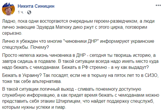 Журналист из Горловки Никита Синицын пишет в Facebook, что Матюха - никакой не разведчик, но вдруг решил им стать, когда решил выбраться "на большую землю".