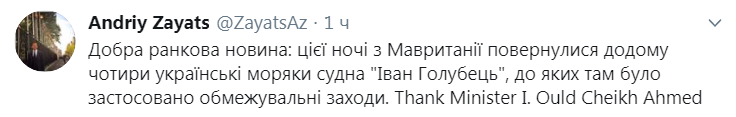 "Хорошая утренняя новость: этой ночью из Мавритании вернулись домой четверо украинских моряков с судна "Иван Голубец", к которым там были применены ограничительные меры", - говорится в записи чиновника.