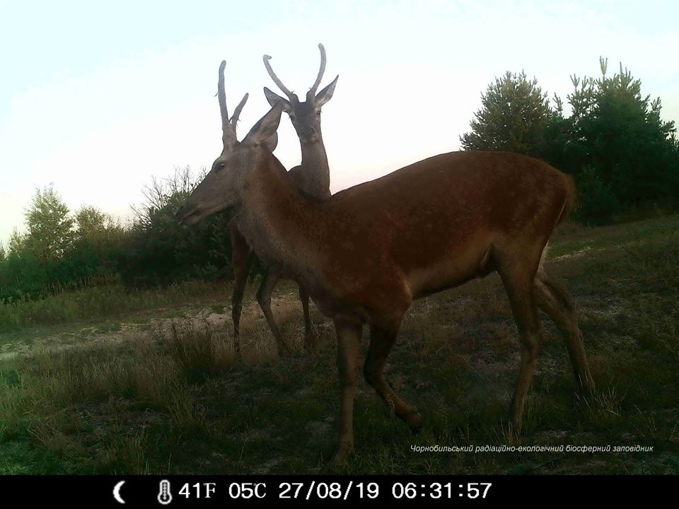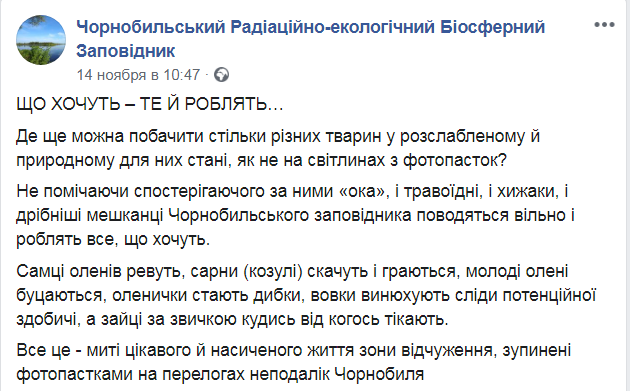 "Не замечая наблюдающего за ними глаза, и травоядные, и хищники, и мелкие жители Чернобыльского заповедника ведут себя свободно и делают все, что хотят. Самцы оленей ревут, серны (косули) скачут и играют, молодые олени бьются, волки вынюхивают следы потенциальной добычи, а зайцы по привычке куда-то от кого-то убегают", - написали сотрудники заповедника.
