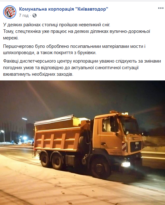 "В некоторых районах столицы прошел небольшой снег. Поэтому спецтехника уже работает на некоторых участках улично-дорожной сети. Первоначально были обработаны посыпочными материалами мосты и путепроводы, а также покрытие из брусчатки. Специалисты диспетчерского центра корпорации внимательно следят за изменениями погодных условий и в соответствии с актуальной синоптической ситуацией будут принимать необходимые меры", - заявили в пресс-службе "Киевавтодора".