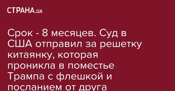 Суд Флориды приговорил ее к 8 месяцам заключения и двум годам надзора после освобождения, как сообщает CNN. Чжан Юцьзин признали виновной в незаконном проникновении на территорию с ограниченным доступом и в предоставлении ложной информации сотрудникам Секретной службы США.