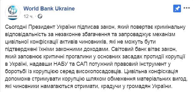 Всемирный банк поприветствовал подписанный президентом Украины Владимиром Зеленским закон, возвращающий уголовную ответственность за незаконное обогащение. Свой комментарий этого события пресс-служба международного финансового учреждения разместила в Facebook.