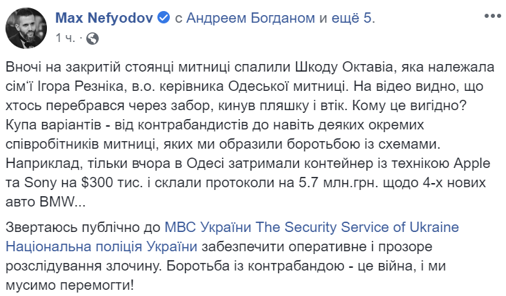 "Ночью на закрытой стоянке таможни сожгли "Шкоду Октавиа", которая принадлежала семье Игоря Резника, и.о. руководителя Одесской таможни. На видео видно, что кто-то перебрался через забор бросил бутылку и убежал. Кому это выгодно? Куча вариантов - от контрабандистов до некоторых отдельных сотрудников таможни, которых мы обидели борьбой со схемами", - отмечается в опубликованном сообщении.