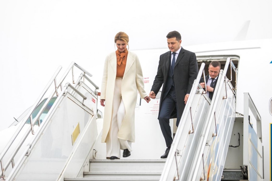 Елена и Владимир Зеленские скускаются с трапа самолета