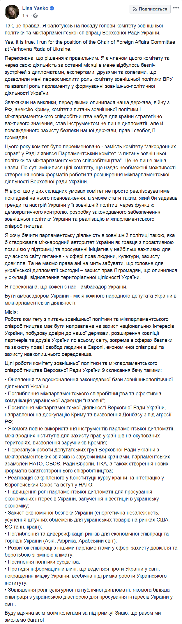 В посте потенциальная преемница Яременко подробно прописала миссию и цели комитета. Так, она считает, что орган должен защищать национальные интересы Украины, расширять коалиции партнеров и друзей Украины во всем мире в сферах безопасности, защиты прав и свобод человека и экономики.