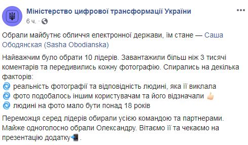 Там отметили, что победителя среди лидеров выбирали всей командой и партнерами. "Почти единогласно избрали Александру. Поздравляем ее и ждем презентации приложения", - сообщили в министерстве.