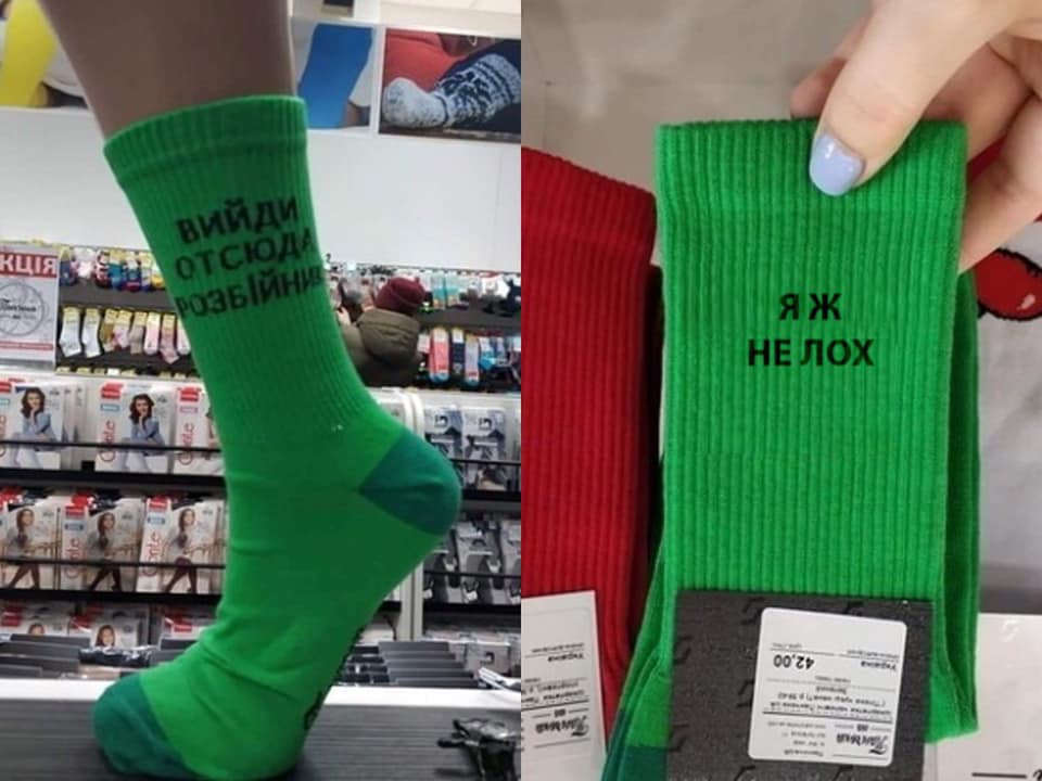 "Вийди отсюда розбійник". В Житомире продают носки с цитатами Зеленского. Фото