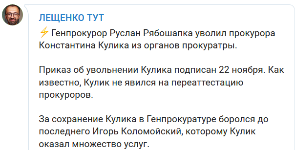 "Генпрокурор Руслан Рябошапка уволил прокурора Константина Кулика из органов прокуратры. Приказ об увольнении Кулика подписан 22 ноября. Как известно, Кулик не явился на переаттестацию прокуроров", - говорится в сообщении.