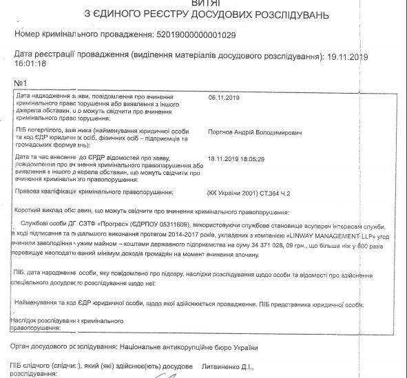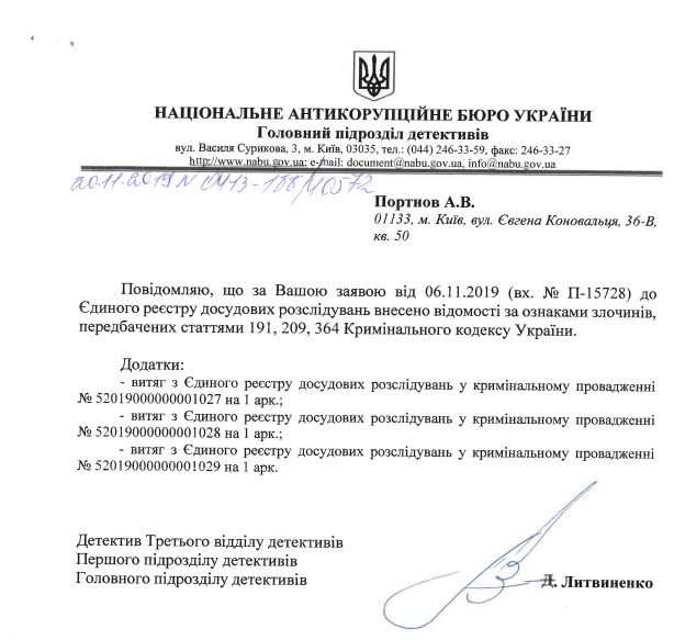 Портнов также опубликовал выписки из Единого реестра досудебных расследований, из которых следует, что уголовные производства открыты по ст. 191 ч. 5 (Присвоение, растрата имущества или овладение им путем злоупотребления служебным положением), ст. 204 ч. 3 (Незаконное изготовление, хранение, сбыт или транспортировка с целью сбыта подакцизных товаров) и ст. 364 ч. 2 (Злоупотребление властью или служебным положением) Уголовного кодекса Украины.