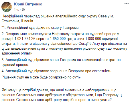 "Неофициальный перевод" решения апелляционного суда округа Свеа по первой жалобе Газпрома на решение Стокгольмского арбитража опубликовал сегодня исполнительный директор Нафтогаза Юрий Витренко на своей странице в соцсети.