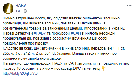 "Только что задержан человек, которого следствие считает главой преступной организации, которая совершала преступления, связанные с махинациями с растаможкой товаров по заниженным ценам, импортируемых в Украину. Сейчас детективы НАБУ и прокуроры САП совершают необходимые процессуальные действия, связанные с личным вручением этому лицу уведомления о подозрении", - говорится в сообщении.