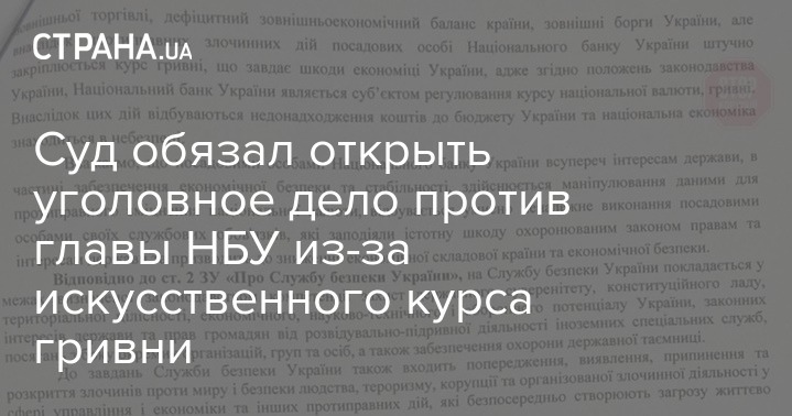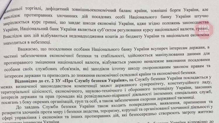 "Считаем, что при таких показателях рост курса гривны возможен только в случае незаконной деятельности должностных лиц Национального банка Украины, что наносит значительный ущерб экономике Украины и грозит подрывом экономической безопасности Украины, – сказано в заявлении.– Должностные лица Национального банка Украины вопреки государственным интересам, которые охраняются законом, осуществляют укрепление национальной валюты путем сокрытия обстоятельств, фактов и данных по сделкам купли-продажи долларов США, которые заключались банками на межбанковском валютном рынке Украины с другими банками и Национальным банком Украины, манипулирования данными внешнеэкономического сальдо при расчете курса гривны, что приводит к наращиванию долгов страны и наносит значительный ущерб экономике Украины и экономической безопасности Украины, и совершили преступление, предусмотренное ч. 1 ст. 111 Уголовного кодекса Украины".