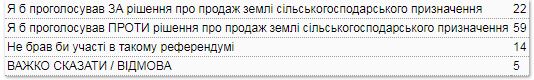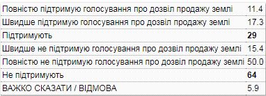 Так, если бы всеукраинский референдум о продаже земли сельскохозяйственного назначения проходил в ближайшее воскресенье, 59% опрошенных ответили, что проголосовали бы "против". И только 22% за.