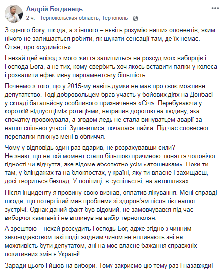 "Не знаю, что на тот момент стало больше причиной: понятие мужского достоинства или ощущение, которое известно абсолютно всем АТОшникам. Пока ты там, в блиндажах и на блокпостах, в стране, которую ты собственно и защищаешь, до сих пор творится беспорядок. В политике, в обществе, на автодорогах", - написал Богданец.