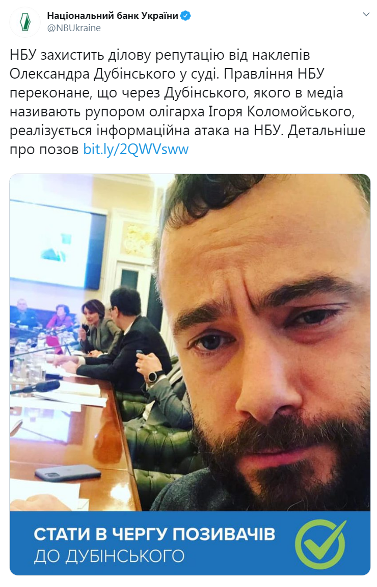 В микроблоге сказано, что НБУ будет защищать свою деловую репутацию от клеветы нардепа. В правлении банка убеждены, что с помощью Дубинского, которого в СМИ называют рупором олигарха Игоря Коломойского, реализуется информационная атака на НБУ.