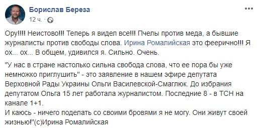 Экс-депутат Борислав Береза назвал ситуацию "пчелы против меда": "Ору!!!! Неистово!!! Теперь я видел все!!! Пчелы против меда, а бывшие журналисты против свободы слова. Ирина Ромалийская это феерично!!! Я ох... ох... В общем, удивился я. Сильно. Очень".