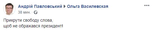 Экс-нардеп Андрей Павловский написал на странице Смаглюк: "Прикрути свободу слова, чтоб не обижался президент!"