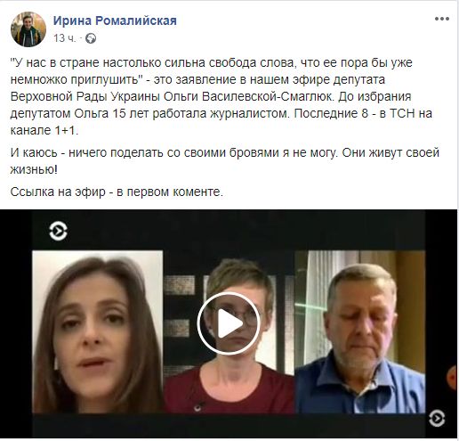 Видео опубликовала журналистка Ирина Ромалийская, прокомментировав его так: "До избрания депутатом Ольга 15 лет работала журналистом. Последние 8 - в ТСН на канале 1+1. И каюсь - ничего поделать со своими бровями я не могу. Они живут своей жизнью!" (речь о том, что журналистка удивленно подняла брови после слов Смаглюк).