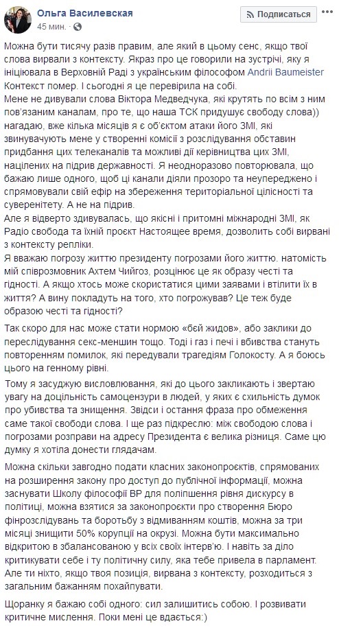 "Простите, но речь шла о прямых угрозах президенту. Это какая-то странная свобода слова...А потому не вижу ничего плохого в таком высказывании Ольги".