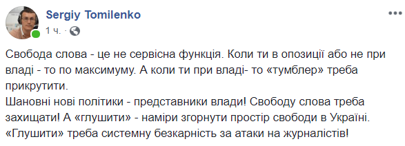 Уважаемые новые политики - представители власти! Свободу слова надо защищать! А "глушить" - намерения свернуть пространство свободы в Украине. "Глушить" надо системную безнаказанность за атаки на журналистов!".