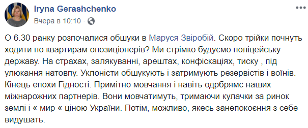 Наиболее характерным стал пост депутата от партии Порошенко Ирины Геращенко.