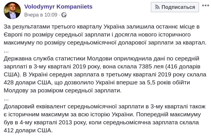 "Государственная служба статистики Молдовы обнародовала данные по средней зарплате в третьем квартале 2019 года, она составила 7385 лея (416 долларов). В Украине средняя зарплата в третьем квартале 2019 составила 428 долларов, что позволило Украине впервые за 5,5 лет обойти Молдову по размеру средней зарплаты", – подчеркнул Компаниец.