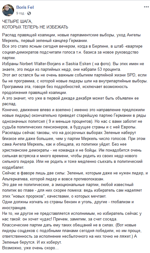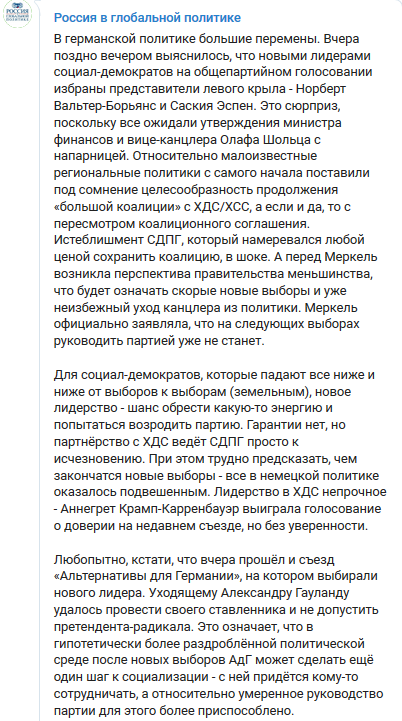 "Вчера поздно вечером выяснилось, что новыми лидерами социал-демократов на общепартийном голосовании избраны представители левого крыла - Норберт Вальтер-Борьянс и Саския Эспен. Это сюрприз, поскольку все ожидали утверждения министра финансов и вице-канцлера Олафа Шольца с напарницей. Относительно малоизвестные региональные политики с самого начала поставили под сомнение целесообразность продолжения большой коалиции с ХДС/ХСС, а если и да, то с пересмотром коалиционного соглашения. Истеблишмент СДПГ, который намеревался любой ценой сохранить коалицию, в шоке. А перед Меркель возникла перспектива правительства меньшинства, что будет означать скорые новые выборы и уже неизбежный уход канцлера из политики. Меркель официально заявляла, что на следующих выборах руководить партией уже не станет.