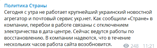 Главный редактор издания Internet.ua, которое входит в "Укрнет", Дмитрий Сизов также написал об отсутствии электропитания. И что, по состоянию на 11:35, сервис заработал.