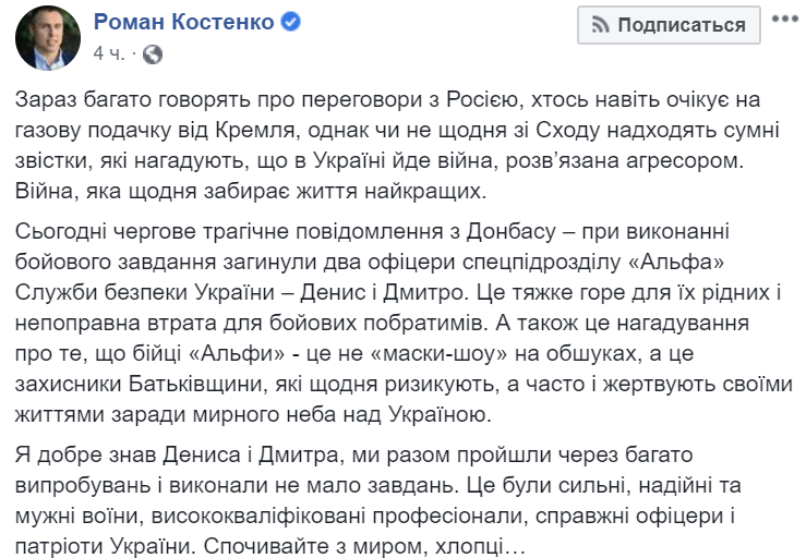 "Сегодня очередное трагическое сообщение с Донбасса - при выполнении боевого задания погибли два офицера спецподразделения "Альфа" Службы безопасности Украины - Денис и Дмитрий. Это тяжелое горе для их родных и невосполнимая потеря для боевых побратимов", - говорится в опубликованном сообщении.
