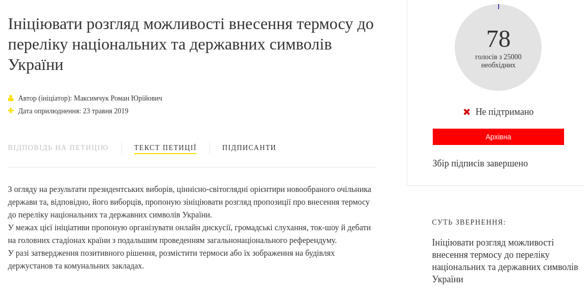Автором петиции является некий Роман Максимчук. Отметим, что 29 мая 2019 года он подавал петицию про "внесение термоса в перечень национальных и государственных символов Украины". Тогда Максимчук писал, что вносит это предложение "с оглядкой на результаты президентских выборов, ценностно-мировоззренческие ориентиры новоизбранного главы государства и, соответственно, его избирателей". Для этого предлагалось провести дискуссии, а, в случае согласия "разместить термосы или их изображения на зданиях госучреждений и коммунальных заведениях". Тогда петиция собрала 78 подписей.