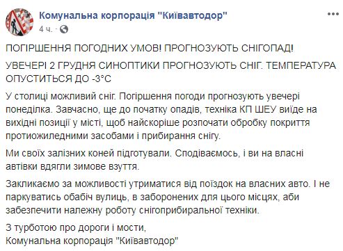 "Киевавтодор" призывает по возможности воздержаться от поездок на собственных авто. "И не парковаться вдоль улиц, в запрещенных для этого местах, чтобы обеспечить надлежащую работу снегоуборочной техники", - пишут коммунальщики.