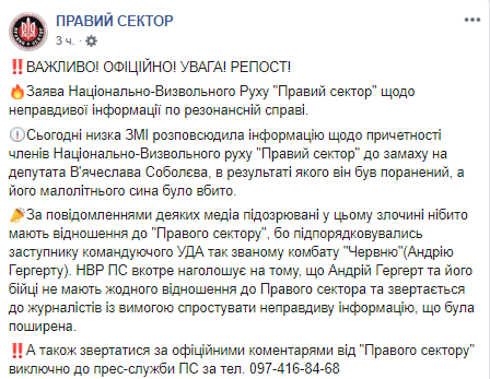 "По сообщениям некоторых медиа подозреваемые в этом преступлении якобы имеют отношение к "Правому сектору", потому что подчинялись заместителю командующего УДА так называемомe комбату "Червню"(Андрею Гергерту). НВР ПС в очередной раз подчеркивает, что Андрей Гергерт и его бойцы не имеют никакого отношения к Правому сектору и обращается к журналистам с требованием опровергнуть неправдивую информацию, которая была распространена", - говорится в сообщении.