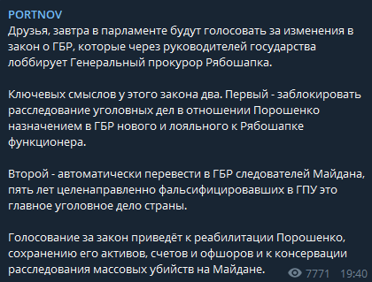 Известный юрист Андрей Портнов заявил, что завтра в Верховной Раде начнется голосование за внесение изменений в закон о ГБР, который лоббирует генпрокурор Руслан Рябошапка. Об этом он сообщил в своем Телеграм-канале.