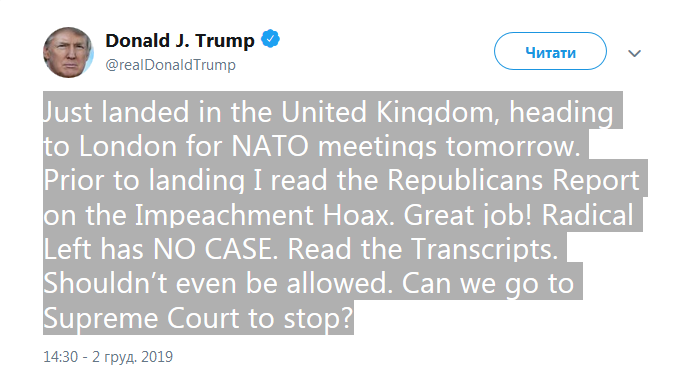"Только что приземлился в Объединенном королевстве. Перед посадкой прочитал отчет республиканцев про весь этот обман с импичментом. Замечательная работа! У радикальных левых нет дел. Читайте стенограммы. Этого нельзя допустить. Можем ли мы обратиться в Верховный суд, чтобы остановить это?", - написал Трамп.