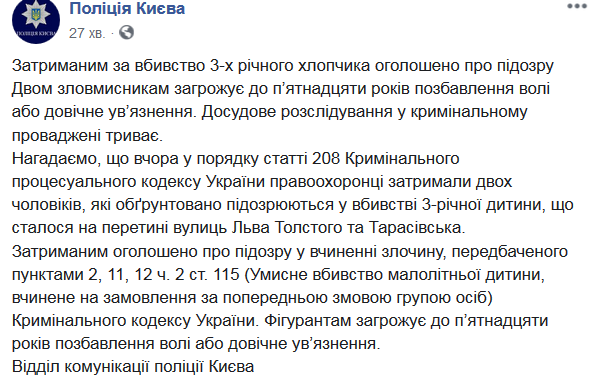 Напомним, что вчера в порядке статьи 208 Уголовно-процессуального кодекса Украины правоохранители задержали двух мужчин, которые обоснованно подозреваются в убийстве 3-летнего ребенка, что произошло на пересечении улиц Льва Толстого и Тарасовская.