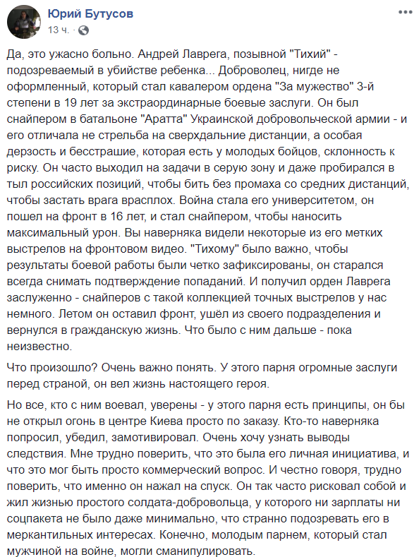 "К сожалению, наше государство не уделяет внимания социализации тех, кто прошел через многие боевые ситуации. Хотя это очень ценные люди", - сокрушается журналист Юрий Бутусов, заявляя, что стрелявший в ребенка снайпер Лаврега "вел жизнь настоящего героя" и имеет "огромные заслуги перед страной".