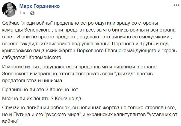 "Сейчас "люди войны" предельно остро ощутили зраду со стороны команды Зеленского , они предают все, за что бились воины и вся страна 5 лет. И они не просто предают , а делают это цинично со смехуечками, весело так диджитализовано под улюлюканье Портнова и Трубы и под криворожско пацанский жаргон Верховного Главнокомандующего и "кровь забудется" Коломойского.