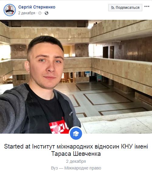 Скандальный одесский праворадикал Сергей Стерненко, который убил человека и до сих пор на свободе, стал студентом Института международных отношений КНУ им Шевченко. Об этом он сообщил в Facebook.