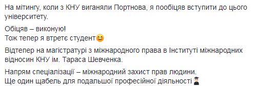 "На митинге, когда из КНУ выгоняли Портнова, я пообещал поступить в этот университет. Обещание выполняю. Итак, теперь я в третий раз студент", - сообщил он.