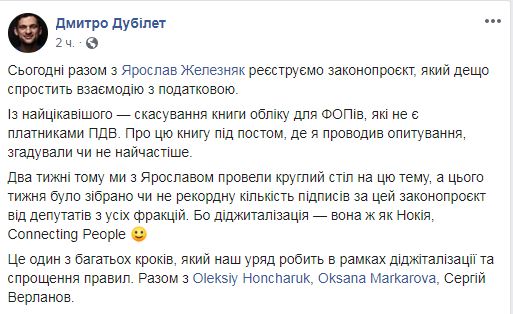 "Сегодня вместе с Ярославом Железняком (первый заместитель главы Комитета ВР по вопросам финансов, налоговой и таможенной политики - Ред.) регистрируем законопроект, который несколько упростит взаимодействие с налоговой. Из самого интересного - отмена книги учета для ФОП, которые не являются плательщиками НДС. Об этой книге под постом, где я проводил опрос, вспоминали  чаще всего", - сообщил он.