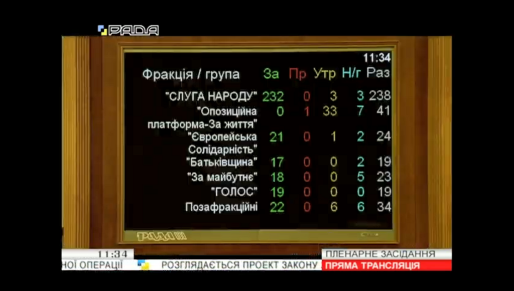 За законопроект проголосовали 329 народных депутатов. "За высказались почти все фракции, кроме "Оппозиционной платформы - За жизнь".