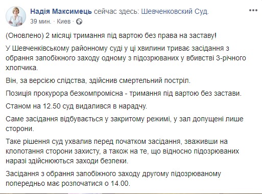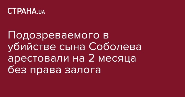 Шевченковский районный суд решил взять под стражу сроком на два месяца без права на залог подозреваемого в убийстве трехлетнего сына депутата Киевского областного совета Вячеслава Соболева. Об этом сообщает спикер прокуратуры Киева Надежда Максимец в Facebook.