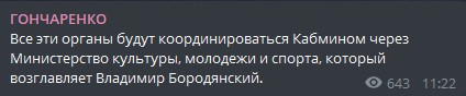 "Все эти органы будут координироваться Кабмином через Министерство культуры, молодежи и спорта, который возглавляет Владимир Бородянский", - написал Гончаренко в своем Telegram-канале в среду.