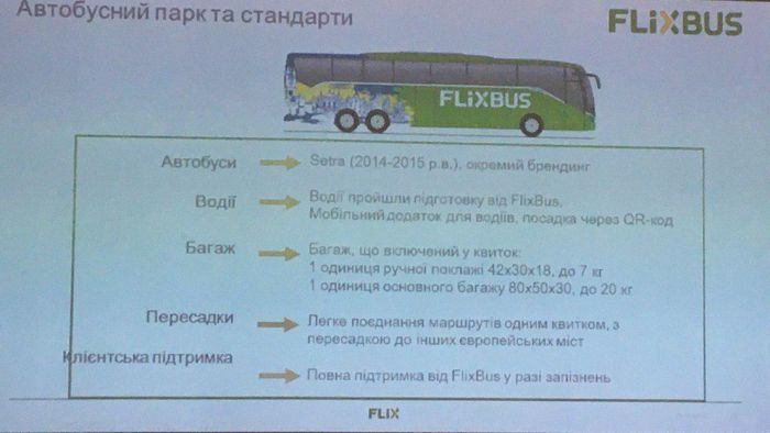 Перевозки в автобусах в фирменной зеленой ливрее и с соответствующим брендированием FlixBus означают,  что согласно политике компании, автобусы должны соответствовать всем стандартам европейского FlixBus.