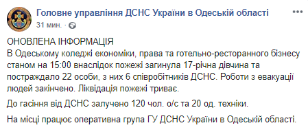 Напомним, в 10:12 среды в Одесском колледже экономики, права и гостинично-ресторанного бизнеса (г.Одесса) на 3 этаже 6-ти этажного учебного корпуса возник пожар, площадь которого достигла 4 тыс кв.м и в 14:18 был локализован. В результате пожара пострадали и были госпитализированы 22 человека, одна женщина впоследствии скончалась. По данным СМИ, двое пострадавших находятся в тяжелом состоянии.