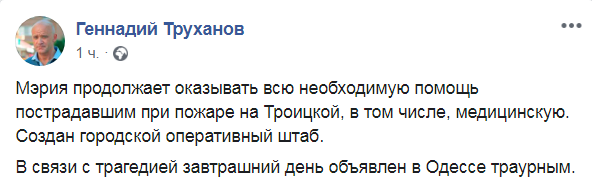 Труханов написал, что мэрия продолжает оказывать всю необходимую помощь пострадавшим при пожаре на Троицкой, в том числе медицинскую. Для этого в Одессе создан оперативный штаб.